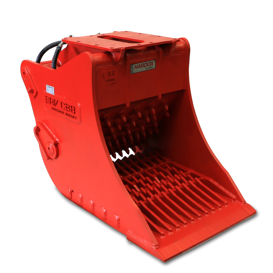 Der BAV-CB8 ist eine leistungsstärkere und robustere Version des CB5 mit Doppelkolben und eignet sich für Mini- und Midibagger von 6,0 bis 9,0 Tonnen. Er ist aus Hardox®-Stahl gefertigt und sorgt so für maximale Haltbarkeit. Er kann mehrere Tonnen Feinkorn (0–50 mm) pro Stunde produzieren. Bei abmontiertem Gitter kann auch gröberes Material (0–100 mm) deutlich schneller verarbeitet werden.