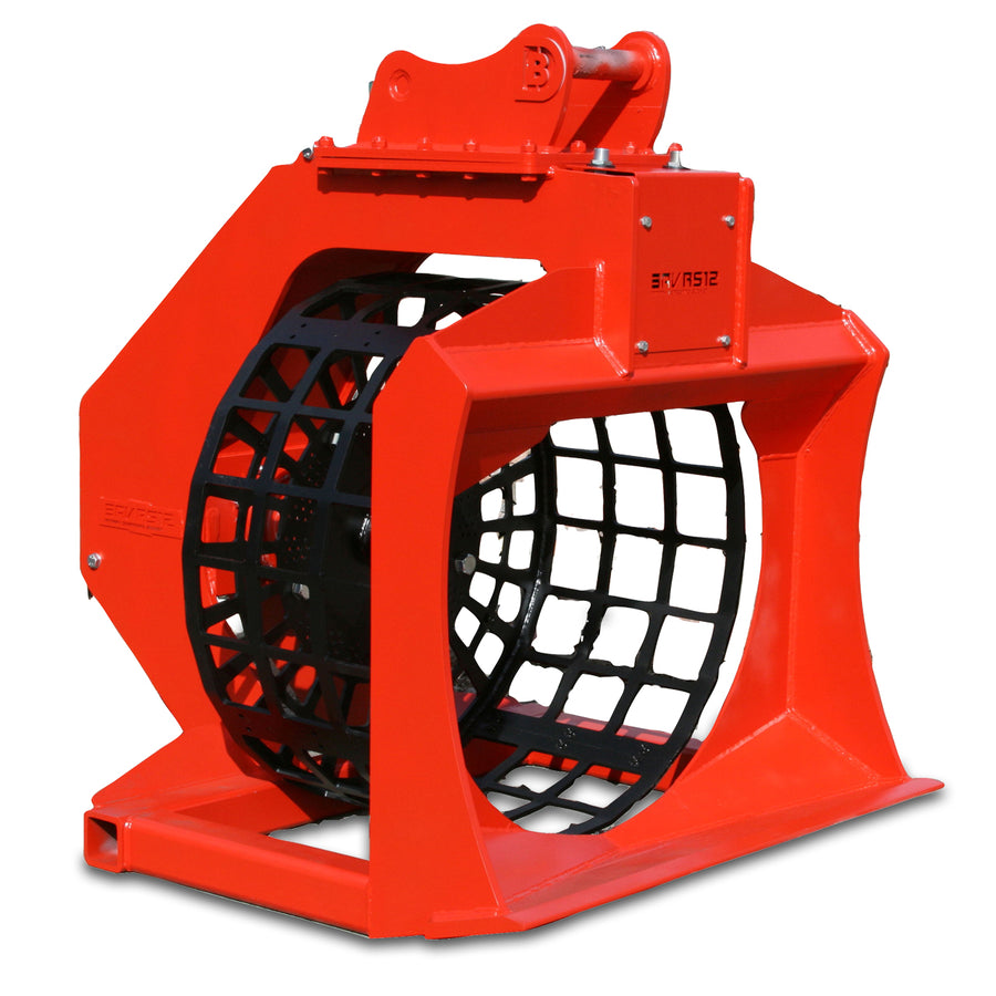 Schnelles, leistungsstarkes Rotationstrommelsieb für Hydraulikbagger von 13 bis 21 Tonnen. Der BAV-RS12 wird komplett mit Sieben für drei Korngrößen geliefert: 25 mm, 50 mm und 75 mm.